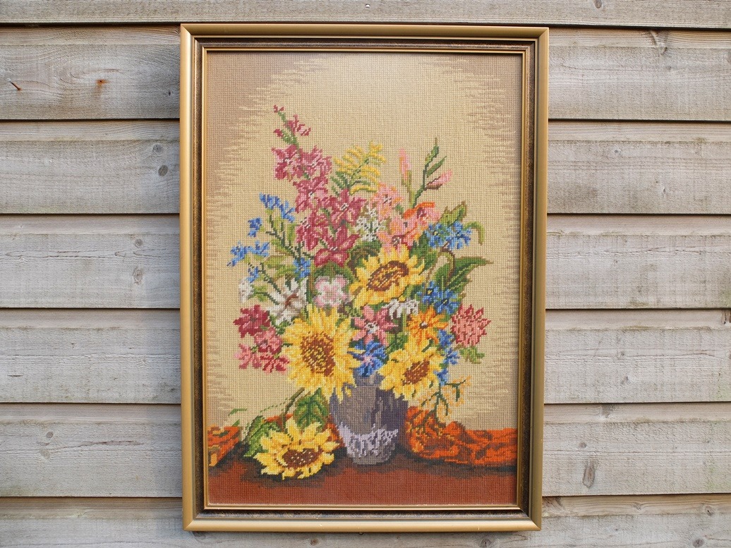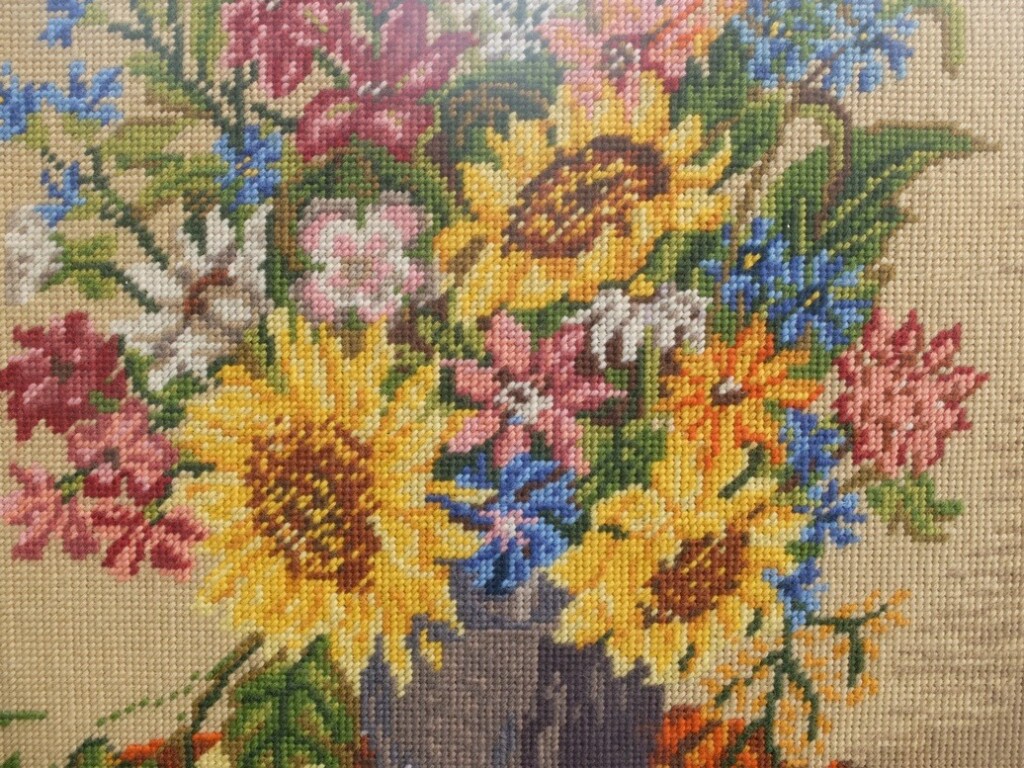 Misschien heeft iemand nog belangstelling voor mijn geborduurde schilderij. Misschien geeft het iemand troost, en misschien accentueert het iemands zomerse blijdschap.