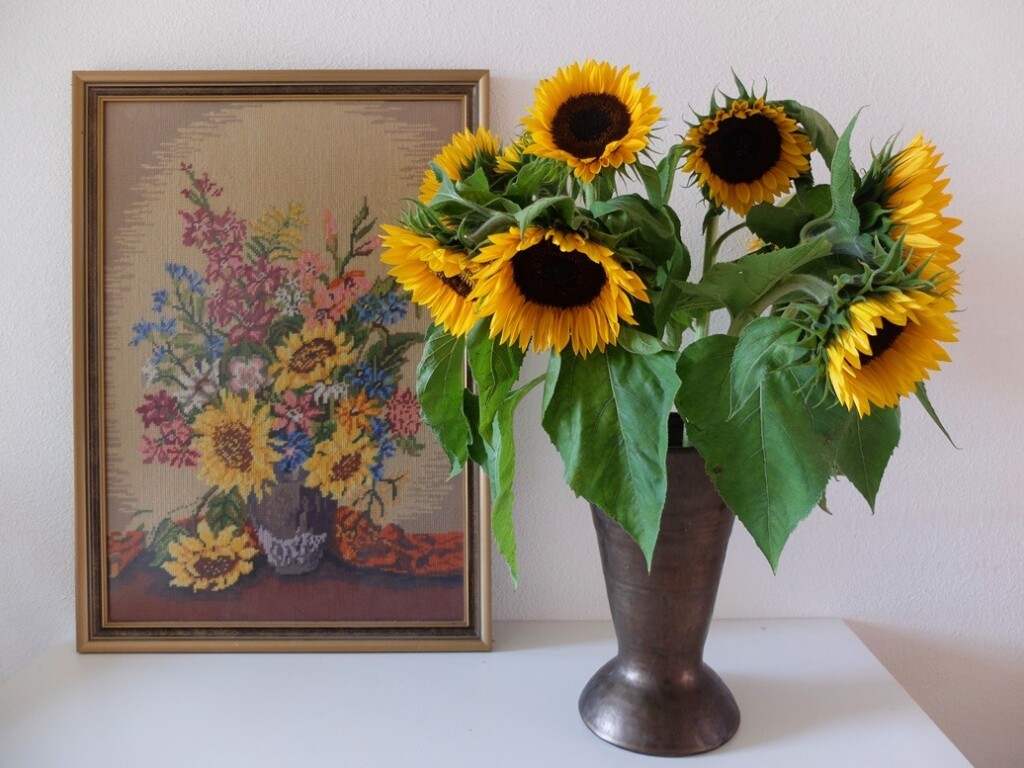 Gister namen we twee grote bossen zonnebloemen mee naar Utrecht, want onze zoon had wat te vieren. En zo heeft iedereen associaties bij deze grote goudgele bloemen. Ze onderstrepen blijdschap, maar ze brengen ook rouw in herinnering.