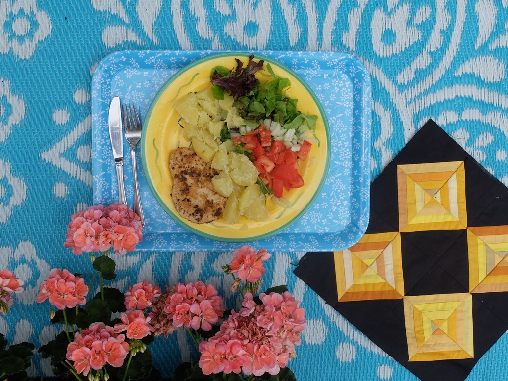 Ach, begin ik daar nu ook al mee? Met foto’s van een bord eten te publiceren? Ik had hem niet gemaakt als blogfoto, maar ik krijg af en toe appjes uit HongKong, met foto’s van wat ze daar op hun bordje krijgen. En toen dacht ik: dan stuur ik ook een foto met mijn zonnige maaltijd. Sla en paksoi uit eigen moestuin, en verder niet te moeilijk doen. Alles is anders als de zon zo overvloedig schijnt!